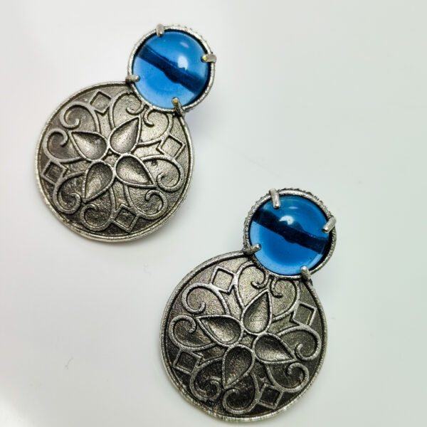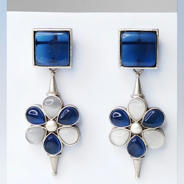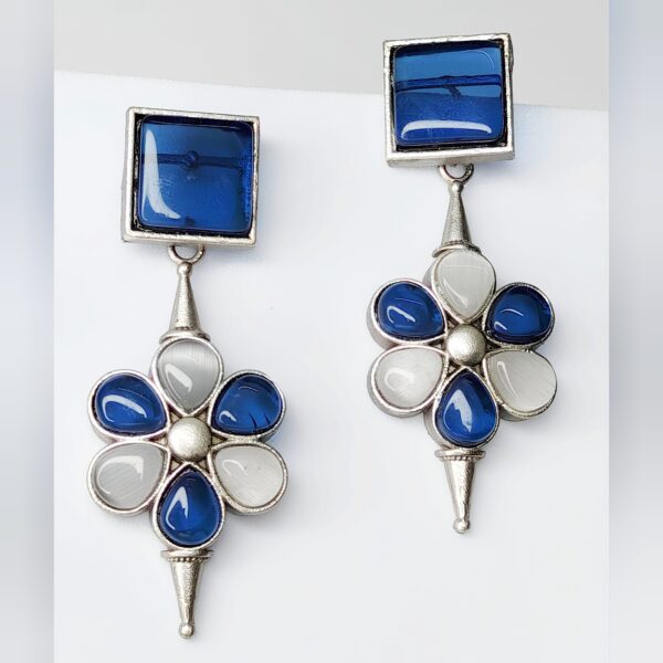 Contemporary Blue & white Stone Statement Earrings with Floral Design