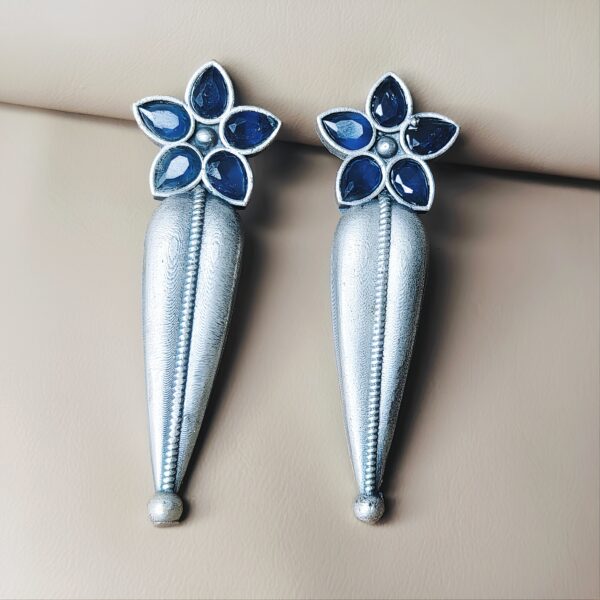 Oxidised Silver Blue Floral Long Drop Earrings
