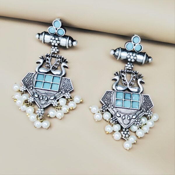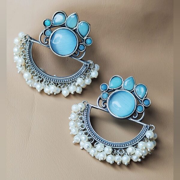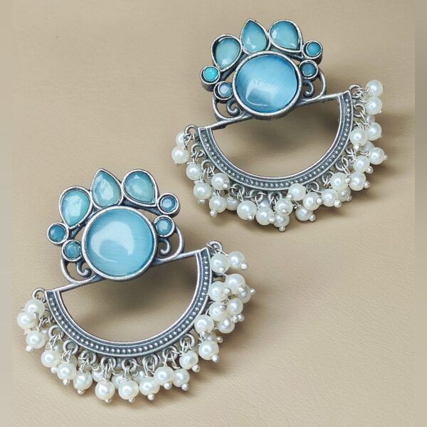 Oxidised Designer Semi-Circle Blue Stone Pearl Earrings