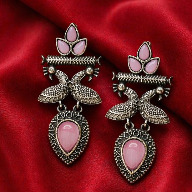 Elegant Rose Pink Stone and Gold-Finished Artistic Bird Earrings