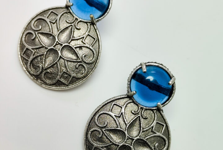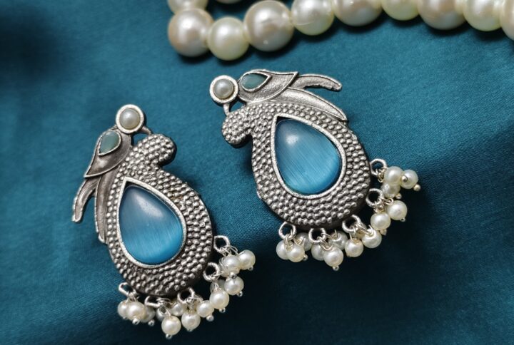 Earring oxidised silver polish with a smooth yet subtly textured finish, giving them a refined and contemporary appeal. The top is adorned with vibrant aqua-blue floral stones that add a fresh and eye-catching contrast. The elongated drop design enhances the overall sleek and graceful look. Perfect for both casual and festive wear, these earrings offer a modern twist to traditional styling.