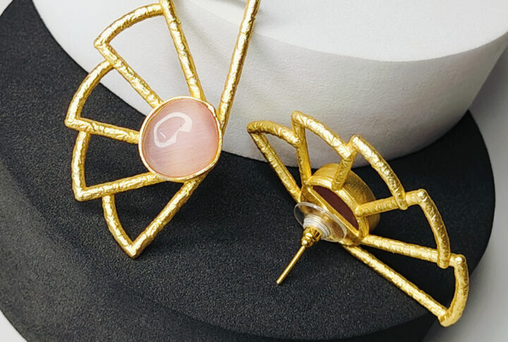 Gold polish with a sleek geometric triangle frame paired with a delicate floral motif. At the base sits a soft blush pink round stone with a smooth, glossy finish, adding a subtle yet elegant charm. The combination of modern geometry and floral detailing creates a unique fusion look. Perfect for statement styling with both ethnic and contemporary outfits.